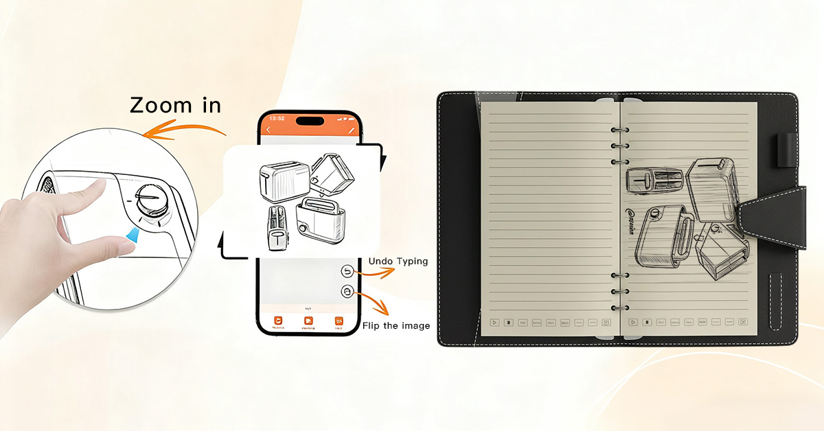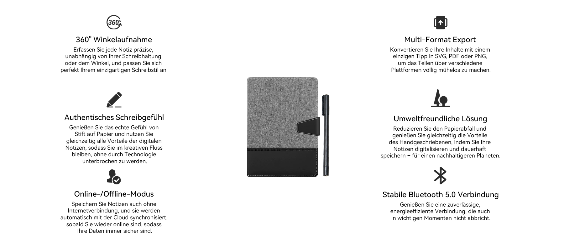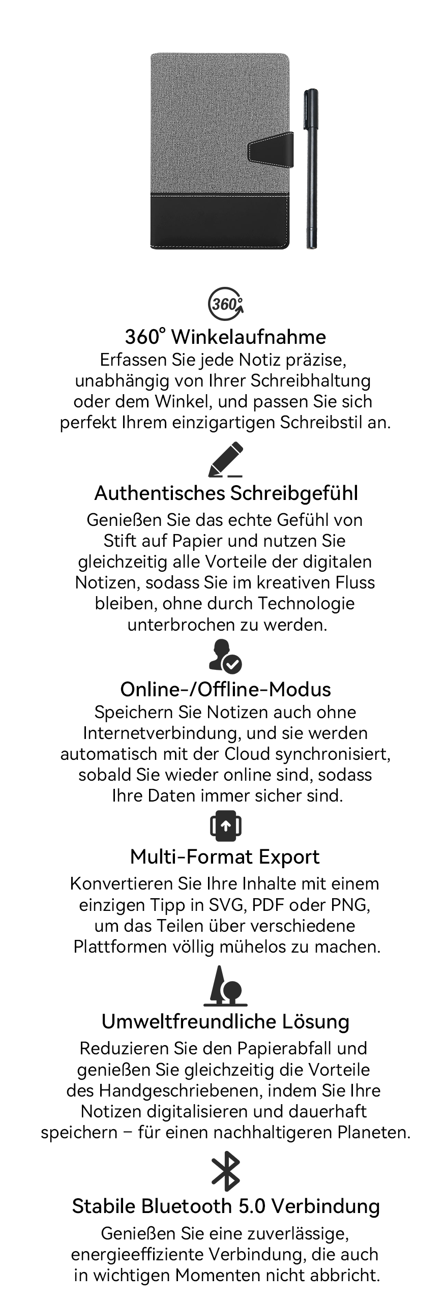 Ob im Flugzeug, in der U-Bahn oder weit entfernt von Signal, jeder Gedanke kann mühelos festgehalten werden. Die Bluetooth-Offline-Speicherung sichert bis zu 50 Seiten und synchronisiert sie automatisch, sobald Sie wieder online sind – sodass Ihre Inspiration immer sicher bleibt.